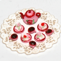 This is a quarter scale tea set. It comes with a teapot, 4 plates w/ pastries and 4 cups with tea in them. They are super tiny!! The plate is only 3/32". I did a close up so you could see and they are so cute in person! It comes on the doily and will pop off easily if you want to move them.