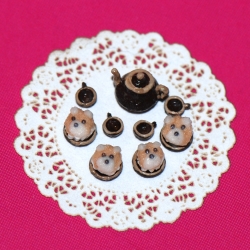 This is a quarter scale tea set. It comes with a teapot, 4 plates w/ bear cupcakes on them. They are super tiny!! The plate is only 3/32". They are so cute in person! It comes on the doily and will pop off easily if you want to move them.