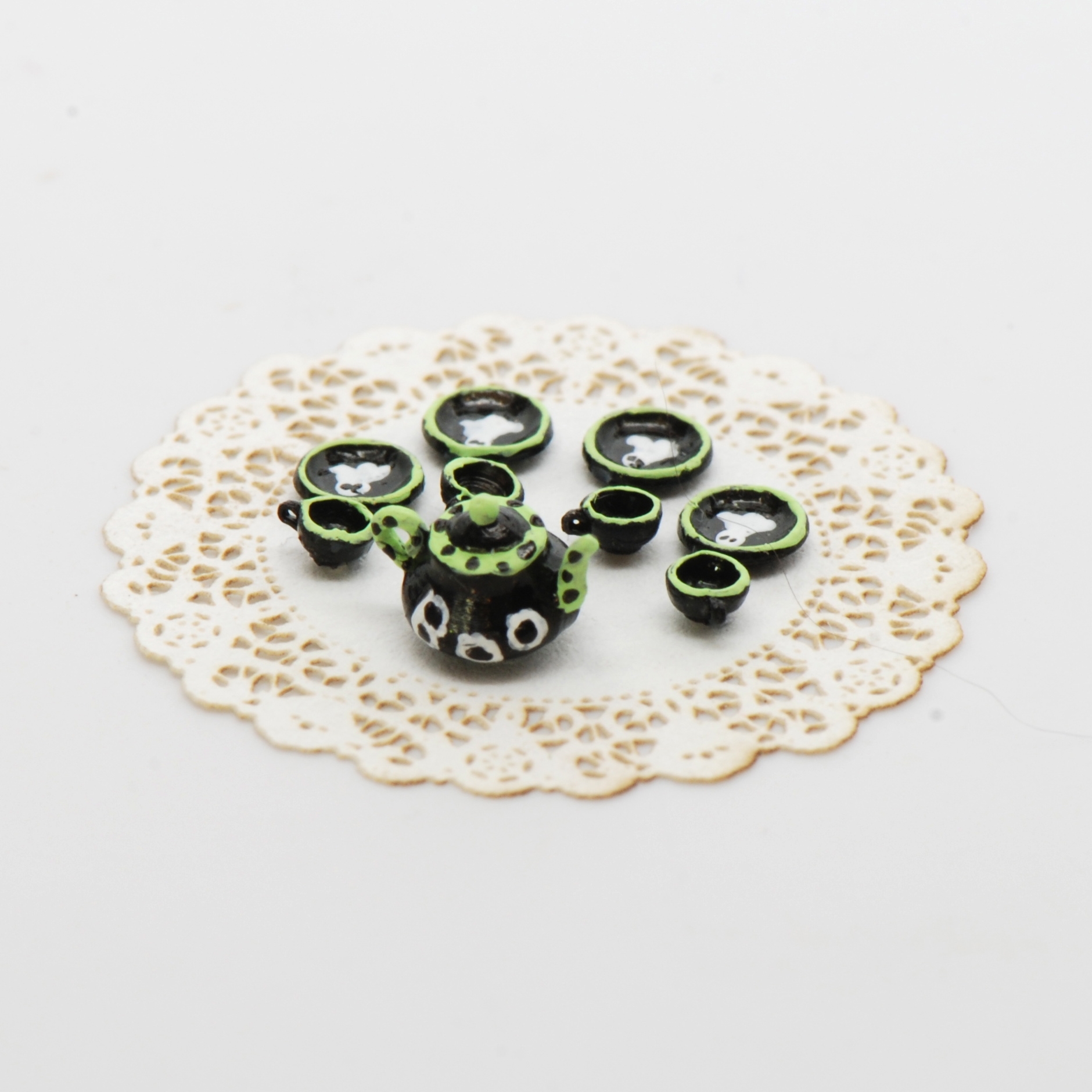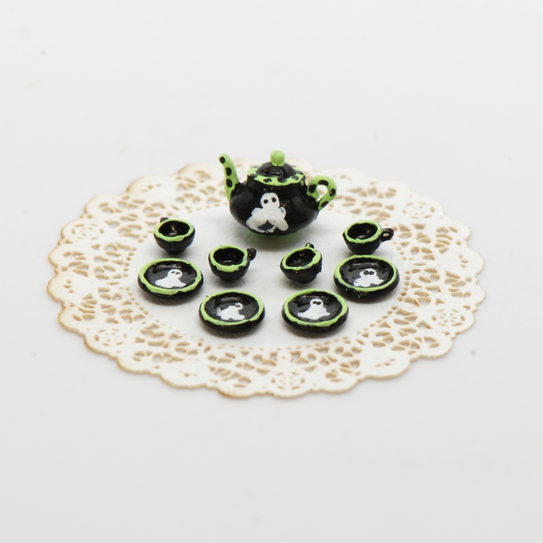 This is a quarter scale Halloween tea set. It comes with a teapot, 4 plates and 4 cups. On the back of the tea pot it says BOO. They are super tiny!! The plate is only 3/32". I did a close up so you could see and they are so cute in person! It comes on the doily and will pop off easily if you want to move them. A wonderful addition to any tiny scene.