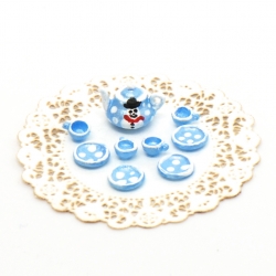 This is a quarter scale Snowman tea set. It comes with a teapot, 4 plates and 4 cups. They are super tiny!! The plate is only 3/32". I did a close up so you could see and they are so cute in person! It comes on the doily and will pop off easily if you want to move them. A wonderful addition to any tiny scene.