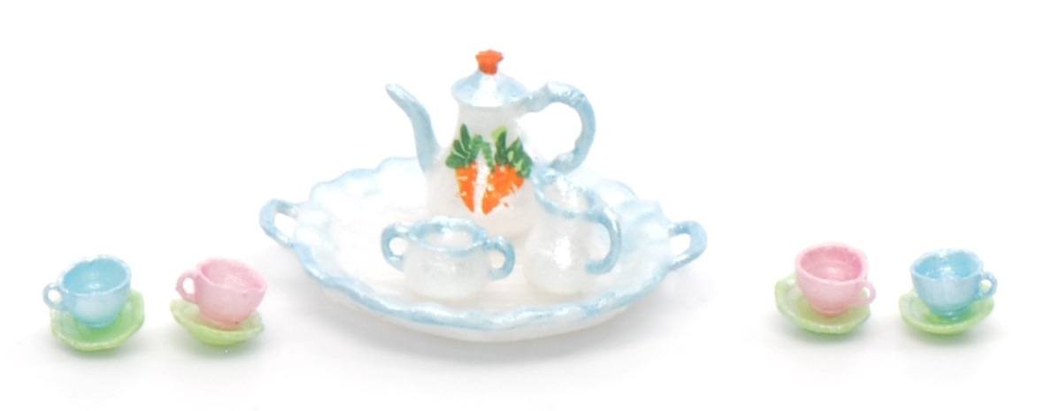 This is a super tiny cute teaset already painted and ready to place in your scene. Comes with a cream and sugar bowl!