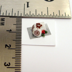 This is a 1:48 scale tiny Christmas yule log cake. It is 1/8" wide and has textured white frosting on it with a chocolate dusting. There are tiny green leaves with red berries on top. It is hand crafted from polymer clay and is not painted. A beautiful addition to any Tiny Scene!