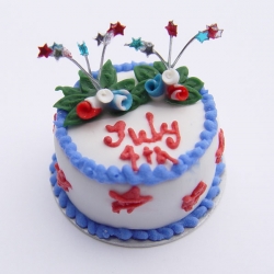 Miniature 1/12 scale cake. This is a handcrafted patriotic cake that is made with polymer clay. The leaves have tiny veins running through each one and the rose buds are individually handcrafted as well. It has 3 layers of white cake with 1 layer of red frosting and 1 of blue. Tiny fire cracker red, blue and silver stars make up the finishing touches. The cake can be sliced too, and you will receive directions on how to slice it if you so chose. Each one is unique and life-like. Sold individually.