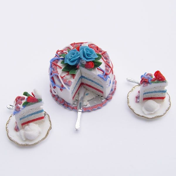 Miniature 1/12 scale cake. This is a handcrafted patriotic confetti cake that is made with polymer clay. The leaves have tiny veins running through each one and the roses are individually handcrafted as well. It has 3 layers of white cake with 1 layer of red frosting and 1 of blue. It comes w/2 slices on gold rimmed plates with a scoop of vanilla ice cream & forks. It can be further sliced too. You will receive directions on how to slice it if you so chose. Each one is unique and life-like. Sold individually.