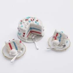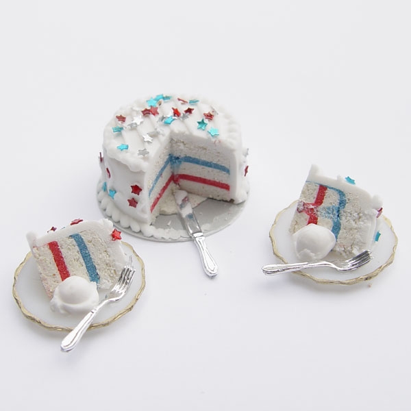 Miniature 1/12 scale cake. This is a handcrafted star cake that is made with polymer clay. It has 3 layers of white cake with 1 layer of red frosting and 1 of blue. It comes w/2 slices on gold rimmed plates with a scoop of vanilla ice cream & forks. It can be further sliced too. You will receive directions on how to slice it if you so chose. Each one is unique and life-like. Sold individually.
