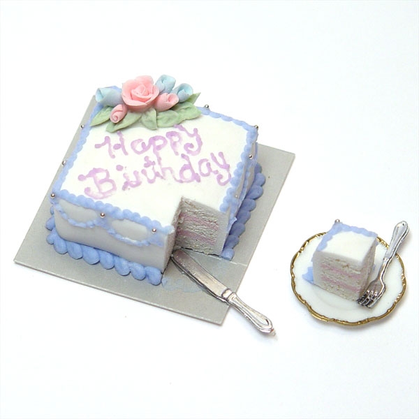 Miniature 1/12 scale cake. This is a beautiful handcrafted Happy Birthday cake that is made with polymer clay. It is a 1" x 1" square cake that comes with a slice on a plate with a fork and knife. The leaves have tiny veins running through each one and the roses are individually handcrafted as well. It has 3 layers of white cake with 2 layers of pink frosting. The cake can be further sliced too, and you will receive directions on how to slice it if you so chose. Each one is unique and life-like. Sold individually.
