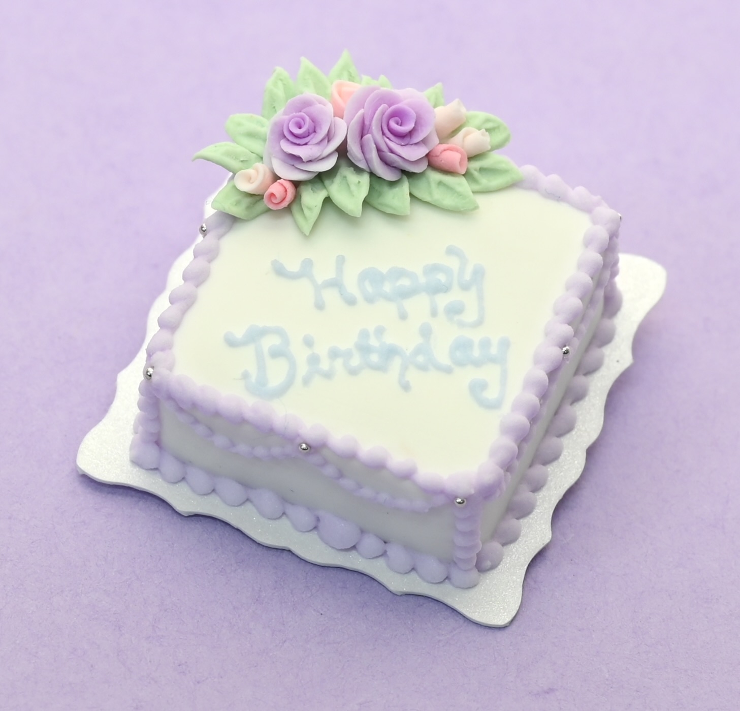 Miniature 1/12 scale cake. This is a beautiful handcrafted Happy Birthday cake that is made with polymer clay. It is a 1" x 1" square cake. The leaves have tiny veins running through each one and the roses are individually handcrafted as well. It has 3 layers of white cake with 2 layers of pink frosting. The cake can be sliced too, and you will receive directions on how to slice it if you so chose. Each one is unique and life-like. Sold individually.