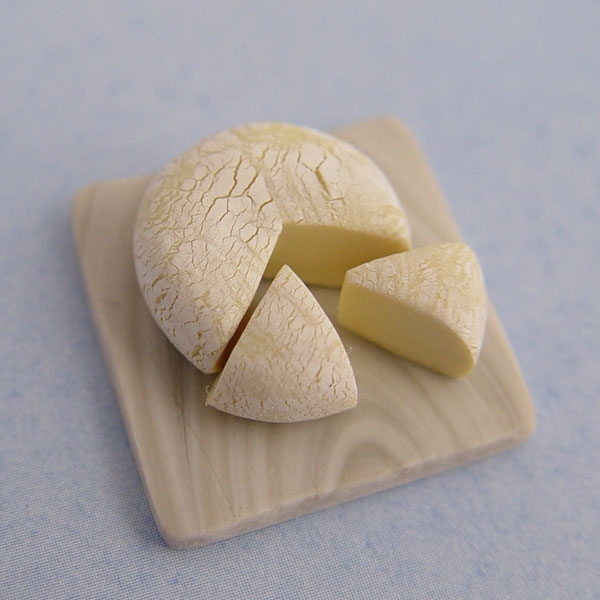 1:12 scale miniature Brie cheese on a square marble cutting board. The board and cheese are made from polymer clay. There is tiny cracking on the cheese to make it more realistic. Each one is unique and life-like. Sold individually.