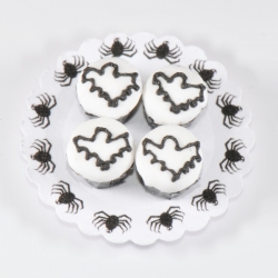This is a plate of 4 cup cakes. They come on a 1" paper plate that has tiny black spiders all around it. The cupcakes and are made from polymer clay. Each plate is unique and life-like.
