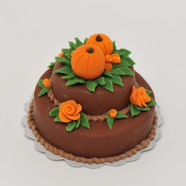 This is a 2 tier chocolate cake made from polymer clay. It is decorated with orange roses and pumpkins. It has layers of cake and icing and can be sliced if desired.