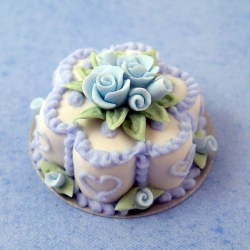 Miniature 1/12 scale cake. This is a 3/4" handcrafted flower shaped cake that is made with polymer clay. The leaves have tiny veins running through each one and the roses are individually handcrafted as well. It has 3 layers of white cake with 2 layers of pink frosting. The cake can be sliced too, and you will receive directions on how to slice it if you so chose. Each one is unique and life-like. Sold individually.