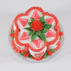 Miniature 1/12 scale cake. This is a 3/4" handcrafted flower shaped cake that is made with polymer clay. The leaves have tiny veins running through each one and the roses are individually handcrafted as well. There are tiny strawberry slices on top. It has 2 layers of white cake with 2 layers of frosting. The cake can be sliced too, and you will receive directions on how to slice it if you so chose. Each one is unique and life-like. Sold individually.