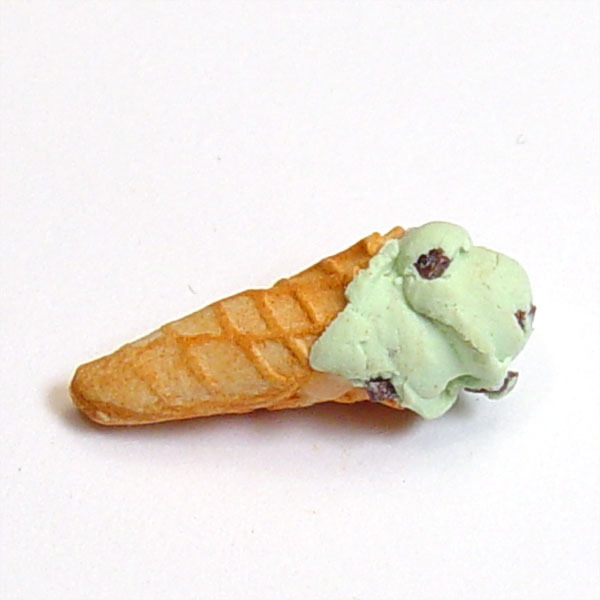Miniature 1/12 scale chocolate chip mint ice cream cone. This is a handcrafted ice cream cone made from polymer clay that is 5/8" long. The cone has a raised texture on the outside making it look very real and is done in an old-fashion style. The ice cream looks good enough to eat! This is a must have for any mini ice cream parlor or collection. Each cone is handmade and unique. Sold individually.
