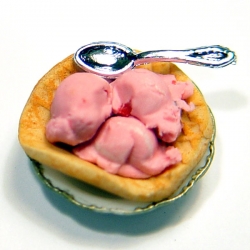 Miniature 1/12 scale Triple scoop cherry chip ice cream cone bowl in a plastic gold rim bowl with a tiny spoon. This is a handcrafted ice cream cone bowl made from polymer clay that is 1/2" wide. The cone has a raised texture on the outside making it look very real and is done in an old-fashion style. The ice cream has tiny cherry chip chunks in it and looks good enough to eat! This is a must have for any mini ice cream parlor or collection. Each bowl of ice cream is handmade and unique. Sold individually.