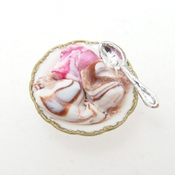 Miniature 1/12 scale triple scoop of chocolate swirl and raspberry swirl ice cream in a bowl with a plastic gold rim bowl and a tiny spoon. This is handcrafted ice cream made from polymer clay in a tiny plastic bowl that is 1/2" wide. This is a must have for any mini ice cream parlor or collection. Each bowl of ice cream is handmade and unique. Sold individually.