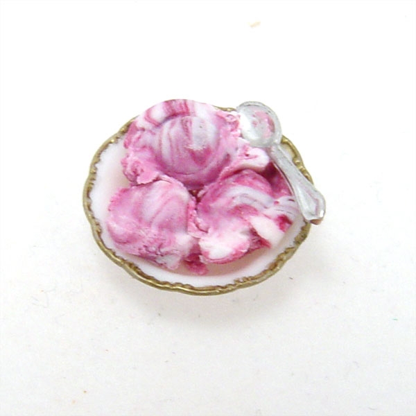 Miniature 1/12 scale triple scoop of raspberry swirl ice cream in a bowl with a gold rim and a tiny spoon. This is handcrafted ice cream made from polymer clay. It is 1/2" wide. This is a must have for any mini ice cream parlor or collection.