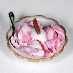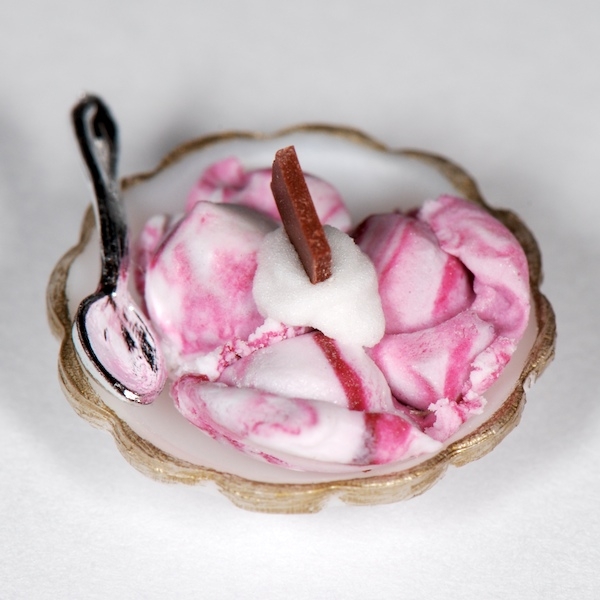 Miniature 1/12 scale triple scoop of raspberry swirl ice cream in a bowl with a tiny spoon. A Chocolate chunk makes this tiny creation complete. This is handcrafted ice cream made from polymer clay. It is 1/2" wide. This is a must have for any mini ice cream parlor or collection.