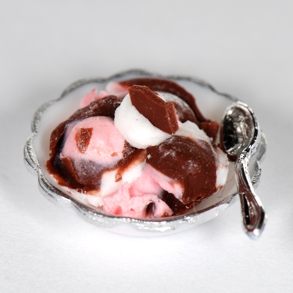 Miniature 1/12 scale triple scoop of neapolitan ice cream in a bowl with a tiny spoon. A Chocolate chunk on whip cream makes this tiny creation complete. This is handcrafted ice cream made from polymer clay. It is 1/2" wide. This is a must have for any mini ice cream parlor or collection.