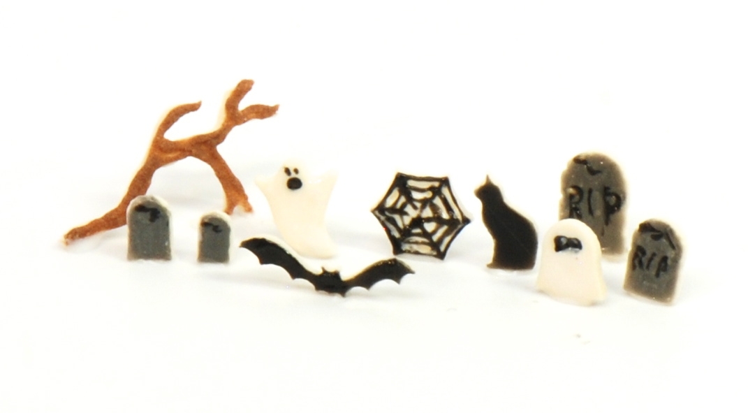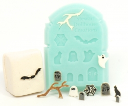 This is a 1:12 Halloween cookie mold. You get a black cat, bat, spider web, 2 types of ghosts, 4 grave stones (2 say RIP) and a very spooky branch! A very fun and easy mold to use. Detailed color directions come with the mold kit along with instructions and ideas on decorating.