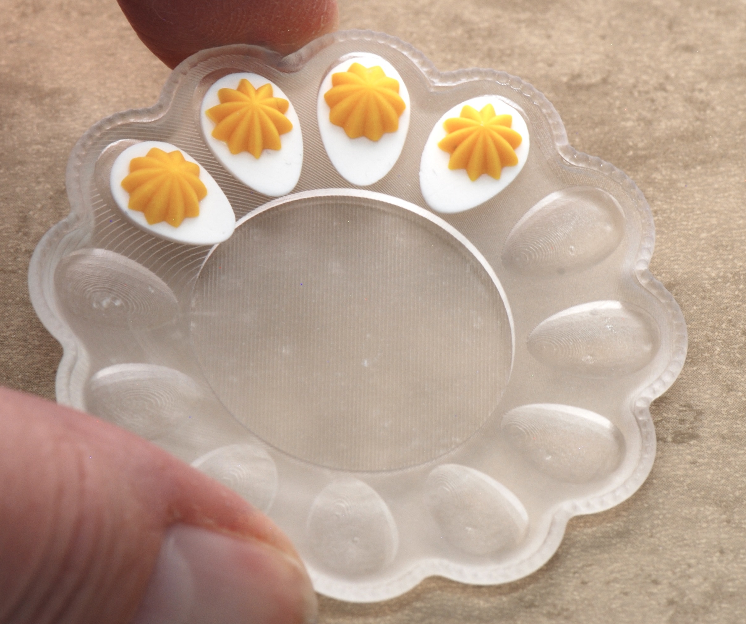 You can also choose the 3D printed Egg platter and it comes in clear resin. You need to sand the support points off just a tiny bit. This kit comes with directions on how to make it colored or clear.