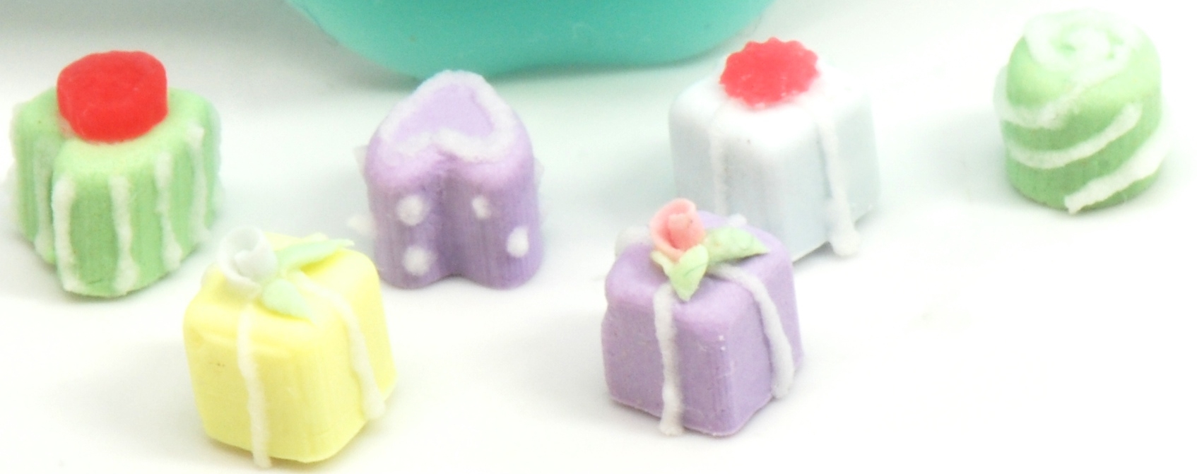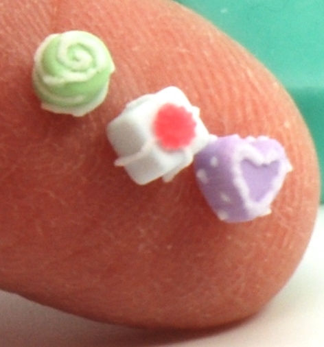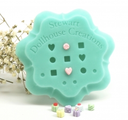This is a wonderfully easy Petit Four mold for 1:12 miniatures. You can use regular Fimo or Sculpey in it and it does not require a mold release. You can bake in the mold and then decorate! There are 4 heart, 4 rounds and 4 square shapes. It also comes with some tiny little flower shapes along the edge for little toppers to top of your petit fours!