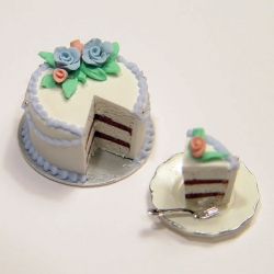 Miniature 1/12 scale cake. This is a handcrafted cake that is made with polymer clay. The leaves have tiny veins running through each one and the roses are individually handcrafted as well. It has 3 layers of white cake with 2 layers of chocolate frosting. The cake is sliced too. The slice is on a tiny plate with a fork on the side of the slice. You will receive directions on how to slice it further if you so chose. Each one is unique and life-like. Sold individually.