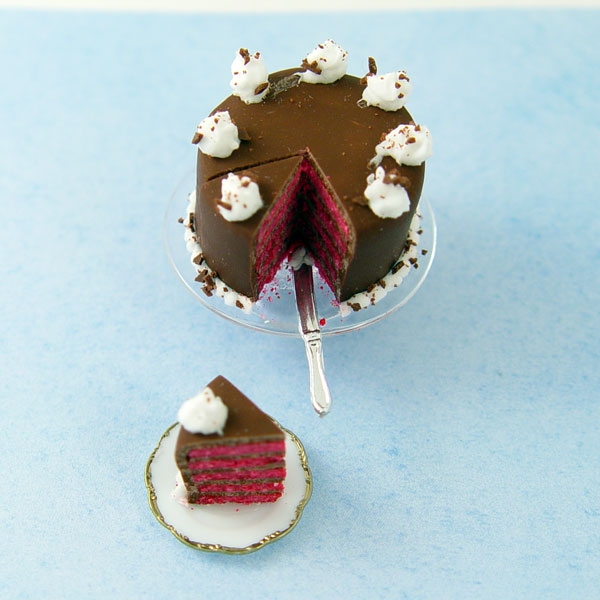 Miniature 1/12 scale cake. This is a 3/4" handcrafted cake that is made with polymer clay. It has 5 layers of red velvet cake with 4 layers of chocolate frosting. There are tiny chocolate chunks dusting the frosting. The cake can be further sliced too, and you will receive directions on how to slice it if you so chose. Each one is unique and life-like. Sold individually.