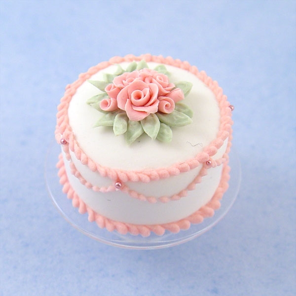 Miniature 1/12 scale cake. This is a 3/4" handcrafted cake that is made with polymer clay and comes on a thin clear glass cake stand. The leaves have tiny veins running through each one and the roses are individually handcrafted as well. It has 3 layers of white cake with 2 layers of white frosting. The cake can be sliced too, and you will receive directions on how to slice it if you so chose. Each one is unique and life-like. Sold individually.