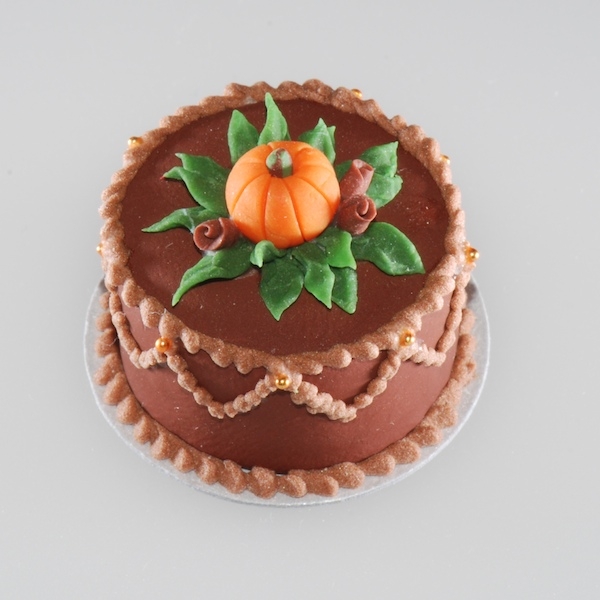 Miniature 1/12 scale cake. This is a handcrafted cake that is made with polymer clay. It is a 3/4" round cake. It has beautiful hand made pumpkins that look like real marzipan pumpkins. The leaves have tiny veins running through each one and the rose buds are individually handcrafted as well. It has 3 layers of chocolate cake with 3 layers of chocolate frosting. The cake can be sliced too, and you will receive directions on how to slice it if you so chose. Each one is unique and life-like. Sold individually.
