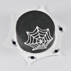 Miniature 1/12 scale cake. This is a handcrafted cake that is made with polymer clay. It is a 3/4" round cake. It has a very beautiful decorated spider web draped on the side. It has 3 layers of vanilla cake with 2 layers of black frosting and 1 layer of black frosting on top. The cake can be sliced too, and you will receive directions on how to slice it if you so chose. Each one is unique and life-like. Sold individually.