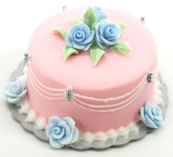 This Pink cake is 7/8" wide and made from Polymer Clay. There is a draping lace pattern around the cake. Handcrafted roses and leaves finish this beautiful creation. It is sliceable too! It comes with directions on how to slice the cake if you chose to. Each cake is unique and life-like and sold separately.