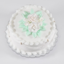Miniature 1/12 scale cake. This is a handcrafted cake that is made with polymer clay. The leaves have tiny veins running through each one and the roses are individually handcrafted as well. It has 3 layers of white cake with 3 layers of pink frosting. The cake can be sliced too, and you will receive directions on how to slice it if you so chose. Each one is unique and life-like. Sold individually.