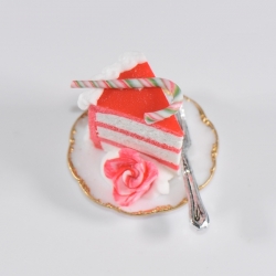 This is a slice of red cake with a candy cane on top and a Christmas rose on the side. It comes on a small plate with a fork.
