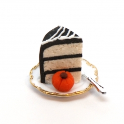 This is a slice of spider web cake. It comes on a plastic plate with a fork and a pumpkin.