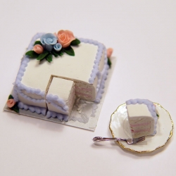 Miniature 1/12 scale cake. This is a handcrafted cake that is made with polymer clay. It is a 1" x 1" square cake. The leaves have tiny veins running through each one and the roses are individually handcrafted as well. It has 2 layers of white cake with 2 layers of pink frosting. The cake can be further sliced too, and you will receive directions on how to slice it if you so chose. Each one is unique and life-like. Sold individually.