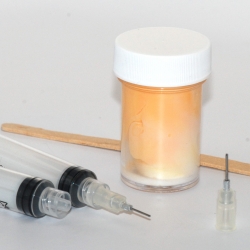 This is a special frosting I use with my cakes and cupcakes. It's water soluble and washes very easily off your hands, but will dry out with time, so just keep it covered when your not using it. It's a 1"x 2" bottle with a screw cap. This set comes with the frosting, 2 syringes, (one for the frosting and one to clean your tips out with) popsicle stick to put the frosting into the syringe with and 2 tips, a 20 gauge and a 22 gauge.