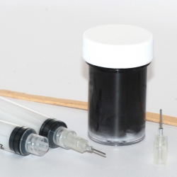 This is a special frosting I use with my cakes and cupcakes. It's water soluble and washes very easily off your hands, but will dry out with time, so just keep it covered when your not using it. It's a 1"x 2" bottle with a screw cap. This set comes with the frosting, 2 syringes, (one for the frosting and one to clean your tips out with) popsicle stick to put the frosting into the syringe with and 2 tips, a 20 gauge and a 22 gauge.