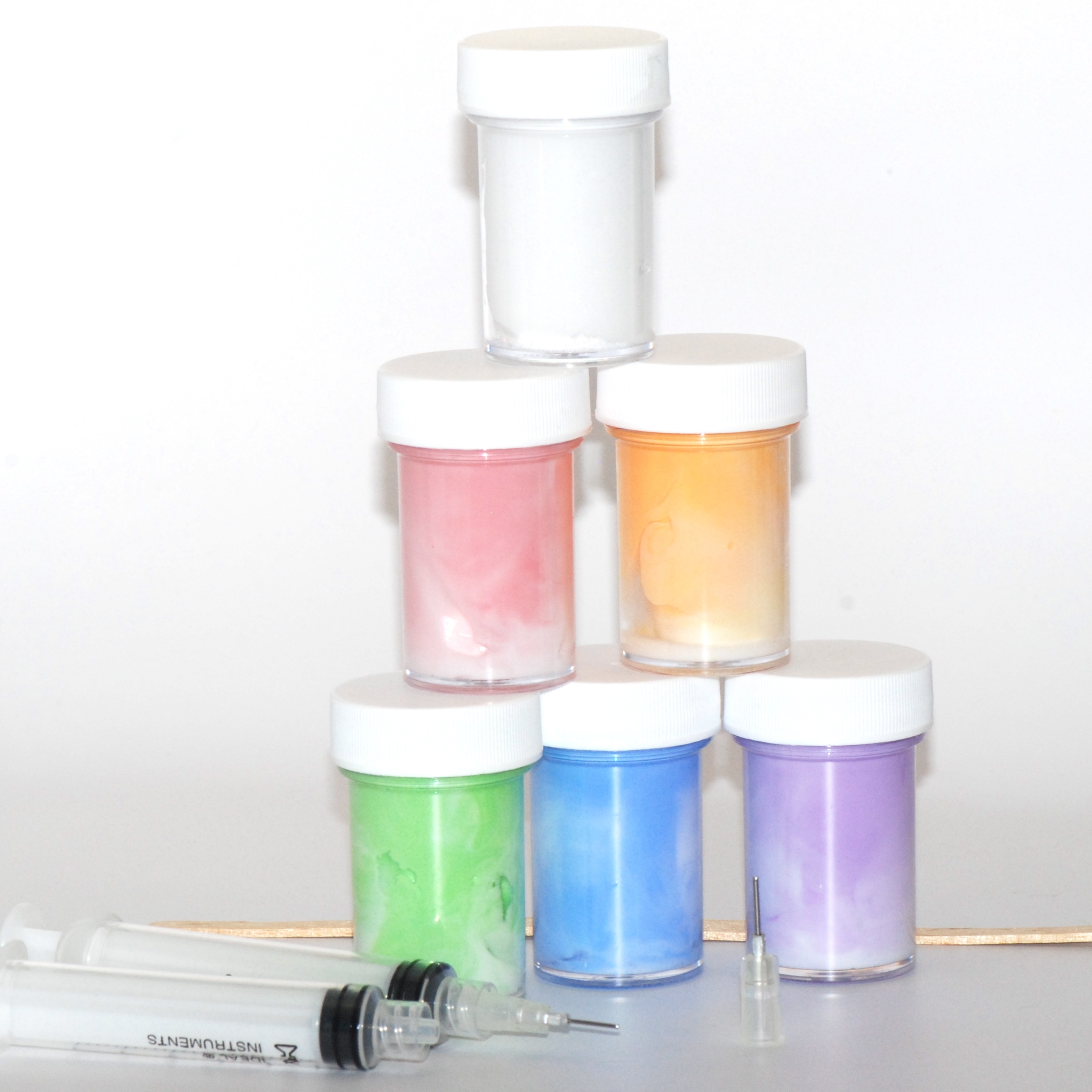 This is a special frosting I use with my cakes and cupcakes. It's water soluble and washes very easily off your hands, but will dry out with time, so just keep it covered when your not using it. It's a 1"x 2" bottle with a screw cap. This set comes with white, pink, peach, lt. green, lt. blue and lt. purple frosting, 7 syringes, (one for the frosting and one to clean your tips out with) popsicle stick to put the frosting into the syringe with and 6 tips, 3-20 gauge and 3-22 gauge.