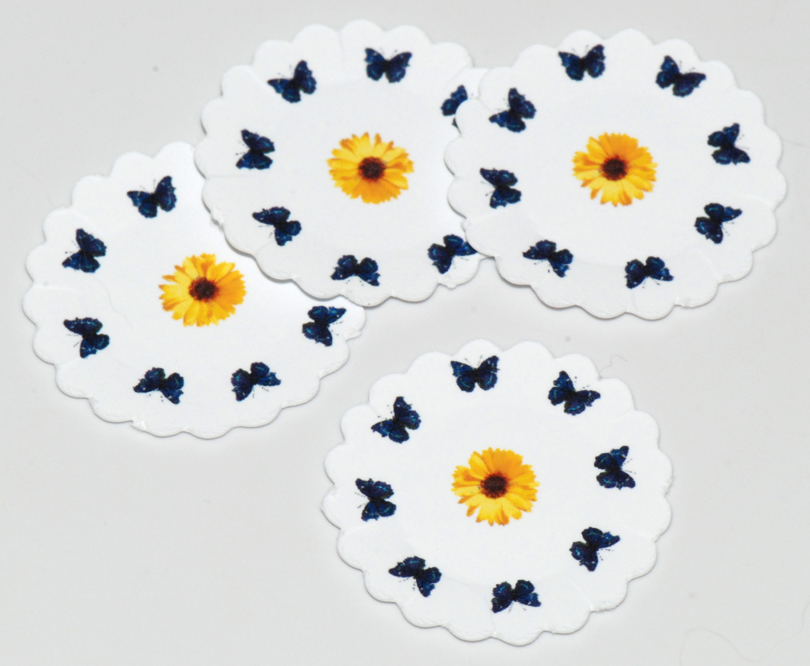 There are 4 paper plates in this set. They are 1" round. Great for cupcakes and cookies!