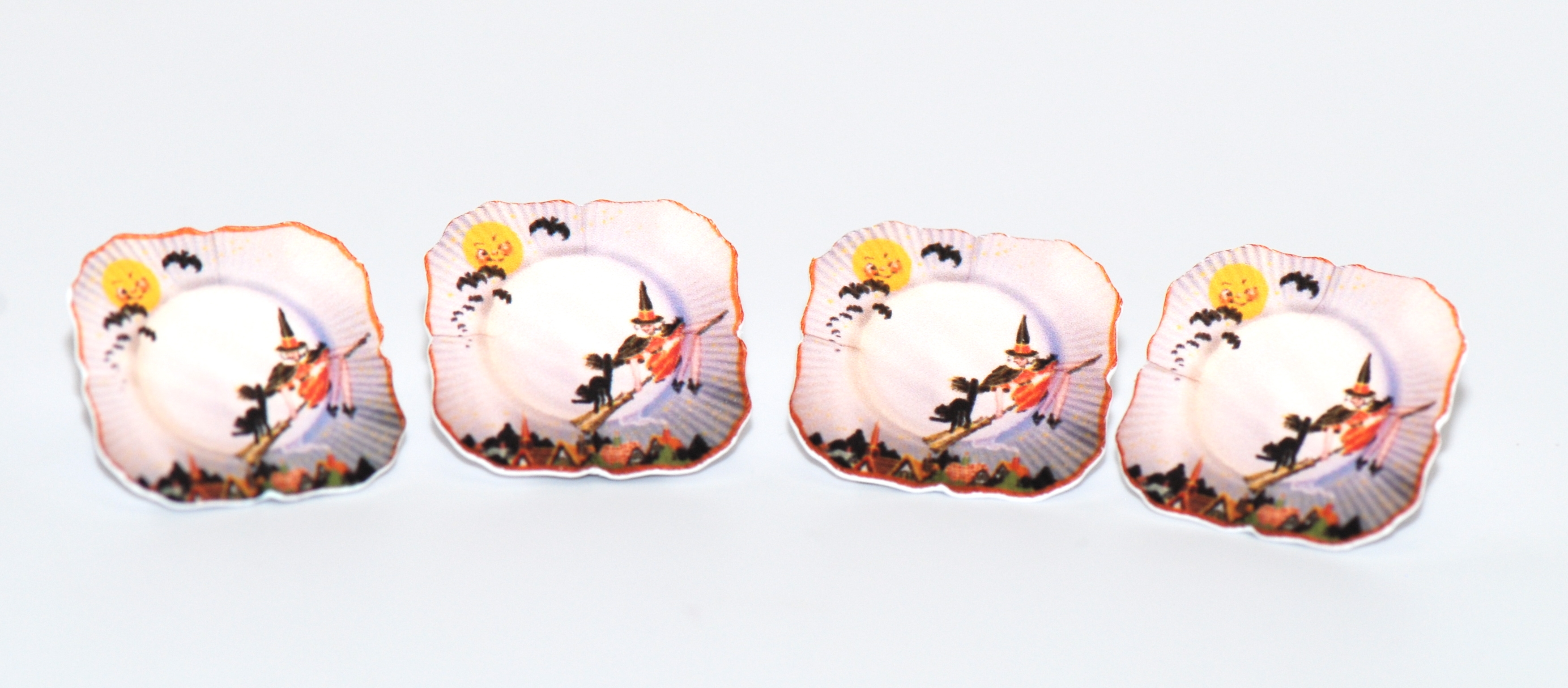This is a set of 4 Halloween plates. Very cute. They fit one cupcake or a few cookies. They are 21/32" (16.5mm) big.