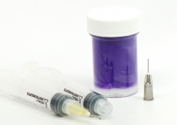 This is a special frosting I use with my cakes and cupcakes. It's water soluble and washes very easily off your hands, but will dry out with time, so just keep it covered when your not using it. It's a 1"x 2" bottle with a screw cap. This set comes with the frosting, 2 syringes, (one for the frosting and one to clean your tips out with) popsicle stick to put the frosting into the syringe with and 2 tips, a 20 gauge and a 22 gauge.