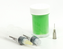This is a special frosting I use with my cakes and cupcakes. It's water soluble and washes very easily off your hands, but will dry out with time, so just keep it covered when your not using it. It's a 1"x 2" bottle with a screw cap. This set comes with the frosting, 2 syringes, (one for the frosting and one to clean your tips out with) popsicle stick to put the frosting into the syringe with and 2 tips, a 20 gauge and a 22 gauge.