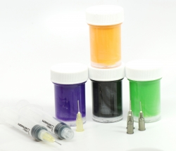 This is a special frosting I use with my cakes and cupcakes. It's water soluble and washes very easily off your hands, but will dry out with time, so just keep it covered when your not using it. It's a 1"x 2" bottle with a screw cap. This set comes with black, dark purple, Halloween orange and dark green frosting, 5 syringes, (one for the frosting and one to clean your tips out with) popsicle stick to put the frosting into the syringe with and 4 tips, 2-20 gauge and 2-22 gauge.