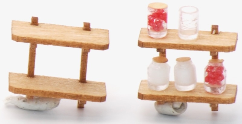 This is a set of 2 1:48 wall shelves. Quick and easy to assemble. Accessories on shelf not included.