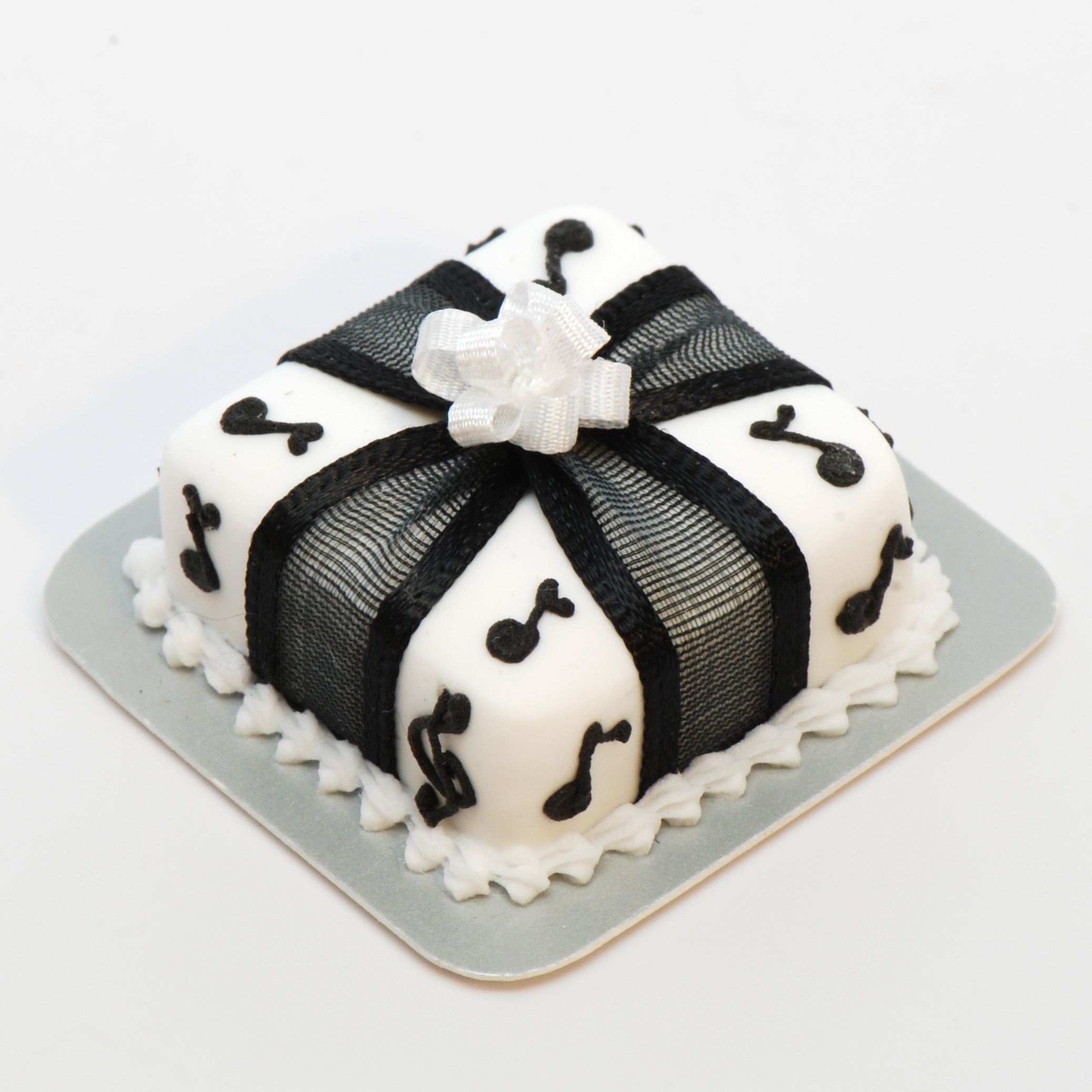 This is a 1:12 music cake. It is made from Sculpey and has an actual music notes on it. This cake has 2 layers of white cake and 1 layers of black frosting in the inside and a white satin bow on top. It can be sliced if you so choose. Directions on how to do this come with the cake. Each one is unique and may differ slightly.