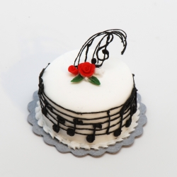 This is a 1:12 music cake. It is made from Sculpey and has an actual music notes on it. This cake has 3 layers of white cake and 2 layers of black frosting in the inside and red roses on top. It can be sliced if you so choose. Directions on how to do this come with the cake. Each one is unique and may differ slightly.