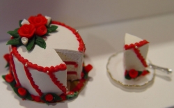 Miniature 1/12 scale cake. This is a handcrafted sliced cake that is made with polymer clay. The leaves have tiny veins running through each one and the roses are individually handcrafted as well. It has 3 layers of white cake with 2 layers of red frosting. It also comes with a slice on a gold rimmed white plate with a tiny fork. The cake can be sliced too, and you will receive directions on how to slice it if you so chose. Each one is unique and life-like. Sold individually.
