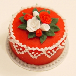 Miniature 1/12 scale cake. This is a handcrafted cake that is made with polymer clay. The leaves have tiny veins running through each one and the roses are individually handcrafted as well. It has 3 layers of white cake with 2 layers of red frosting. The cake can be sliced too, and you will receive directions on how to slice it if you so chose. Each one is unique and life-like. Sold individually.