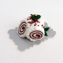 This is a miniature 1/12 scale handcrafted Yule Log cake made with polymer clay. The leaves have tiny veins running through each one with shiny red berries in the center of leaf cluster. It is a roll cake that has realistic cake texture. It is about 3/8"tall by 5/8" long. The cake can be sliced too, and you will receive directions on how to slice it if you so chose. Each one is unique and life-like. Sold individually.