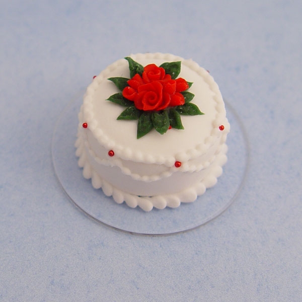 Miniature 1/12 scale cake. This is a 3/4" handcrafted cake that is made with polymer clay and comes on a thin clear glass plate. The leaves have tiny veins running through each one and the roses are individually handcrafted as well. It has 3 layers of white cake with 2 layers of white frosting. The cake can be sliced too, and you will receive directions on how to slice it if you so chose. Each one is unique and life-like. Sold individually.